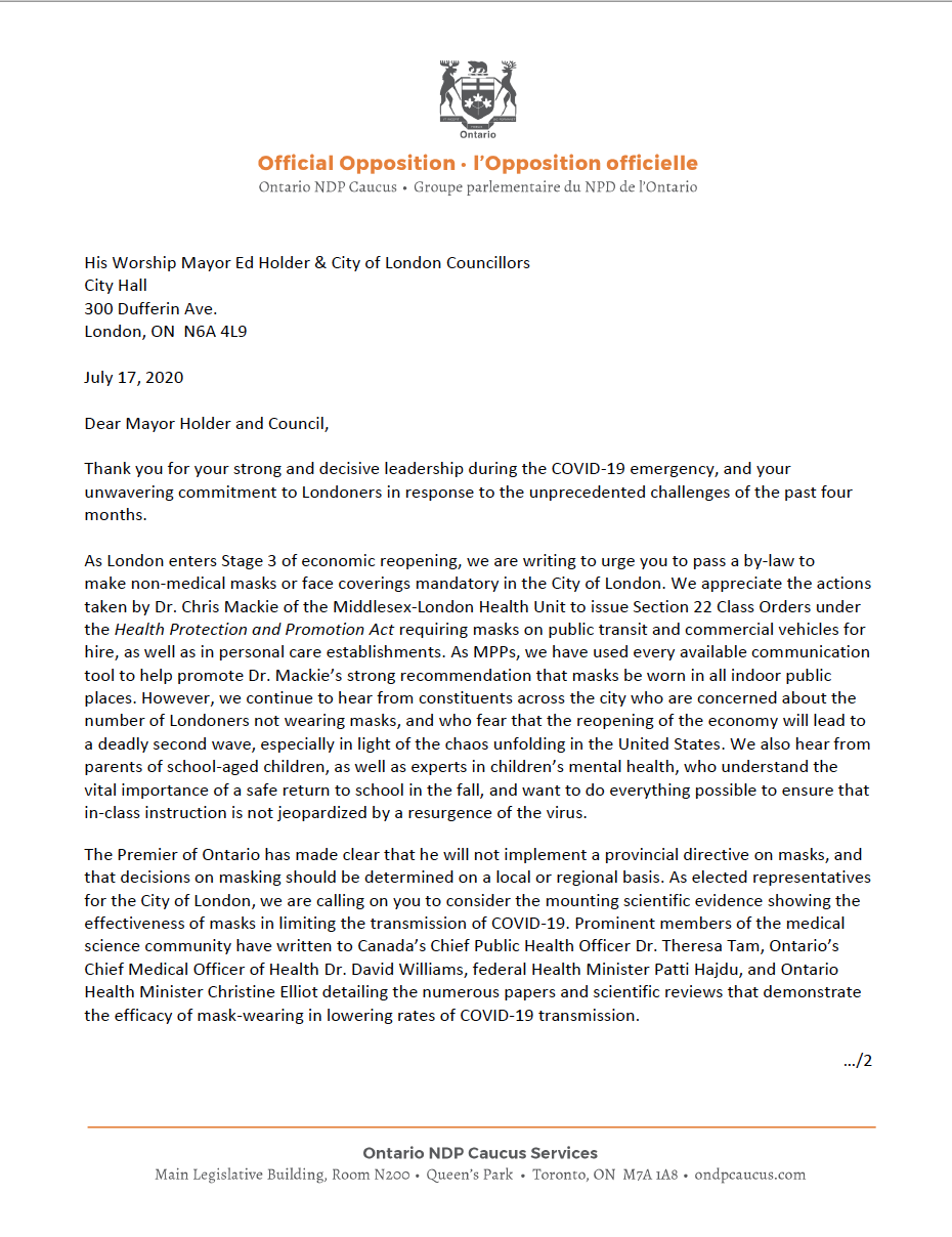 LONDON - MPPs Peggy Sattler (London West), Terence Kernaghan (London North Centre) and Teresa Armstrong (London-Fanshawe) have written an open letter to Mayor Ed Holder and London City Council, expressing their support for Council to pass a by-law making non-medical masks or face coverings mandatory in the City of London.
